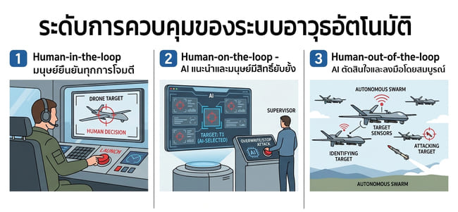 เพื่อทำความเข้าใจปัญหาเชิงจริยธรรมที่แท้จริง จำเป็นต้องเข้าใจกลไกการทำงานของระบบอาวุธอัตโนมัติสังหาร – LAWS (Lethal Autonomous Weapon Systems) ก่อน นักวิชาการอย่าง Paul Scharre จาก Center for a New American Security แบ่งระดับความเป็นอัตโนมัติออกเป็นสามชั้น ได้แก่ (1) Human-in-the-loop ซึ่งมนุษย์ยืนยันทุกการโจมตี (2) Human-on-the-loop ซึ่ง AI แนะนำและมนุษย์มีสิทธิ์ยับยั้ง และ (3) Human-out-of-the-loop ซึ่ง AI ตัดสินใจและลงมือโดยสมบูรณ์2 ระบบ ลาเวนเดอร์ ที่ถูกกล่าวถึงในกรณีของอิสราเอลดูเหมือนจะเคลื่อนระหว่างชั้นที่สองและสามอย่างเลื่อนไหล ขึ้นอยู่กับสถานการณ์ภาคสนาม